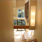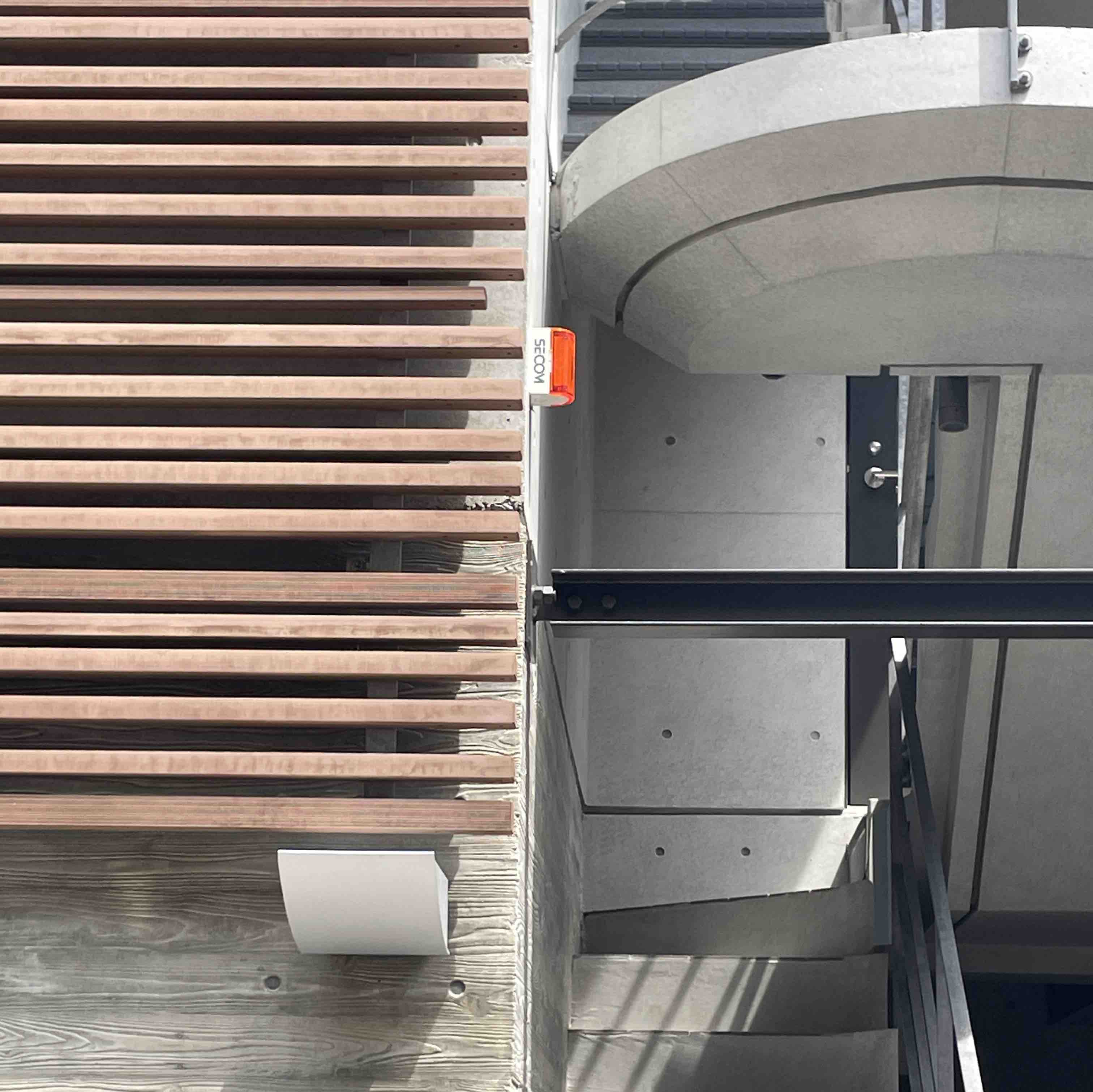 道路沿いの玄関から、4m上の居住スペースまで上る階段は、